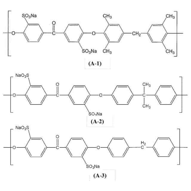 は、それぞれ芳香環に2つ以上存在してもよく、1つの芳香環にスルホン酸基が2つ以上存在する場合には、各スルホン酸基は互いに同一であっても異なっていてもよい。i,j,kおよびlは、それぞれ独立して、0または1を示す。]