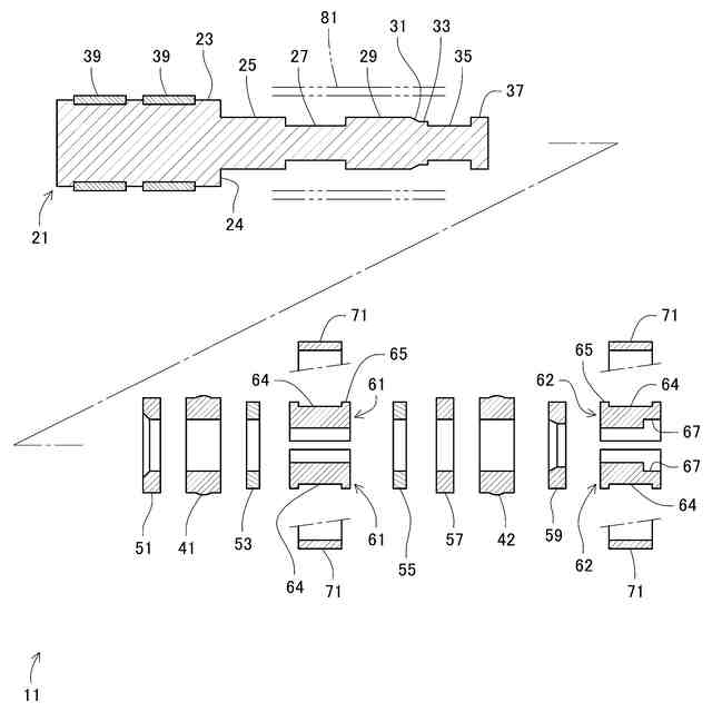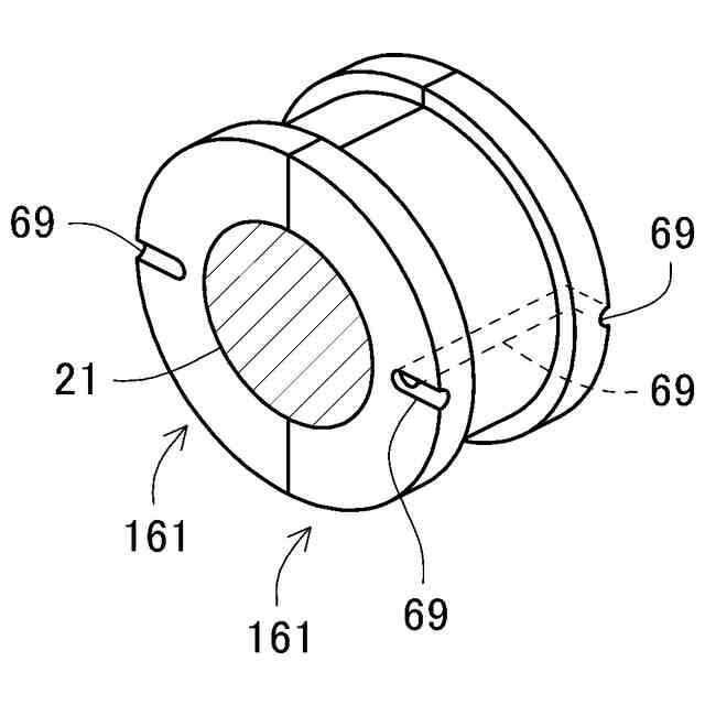 固定具は、その両端面の間で流体を通過させるための流路を有していても良い。流路は、例えば穴や溝で良い。ピストンの移動によって圧縮された流体は、流路を経て固定具を通り抜け、高圧側から低圧側に移動できる。