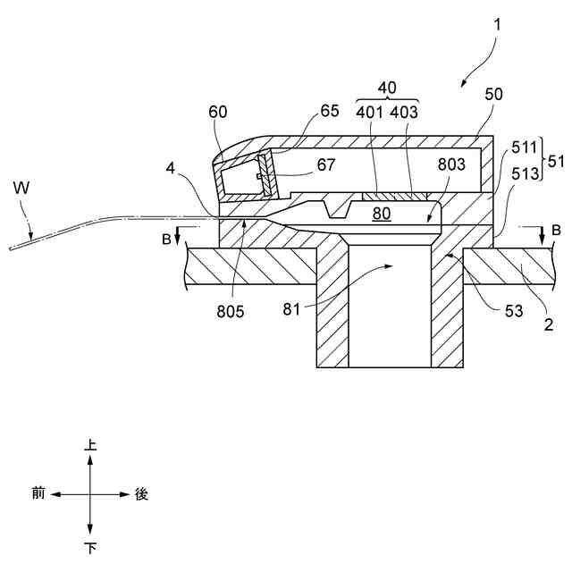 前記コード部材は、前記蓋部の前記前方部より前記後方部側において下方に延伸する、