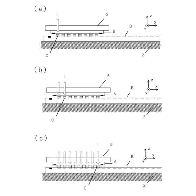 この後、チップ部品Cを加熱してチップ部品Cの電極と基板Bの電極を接合することで、チップ部品Cは基板Bに接合される。ここで、チップ部品Cを加熱する手段としてレーザーを用いる手法が昨今注目を集めており、その例を図9に示す。図9は個々のチップ部品Cをレーザー光Lで加熱する方法であり、レーザー光のエネルギー密度の高さから、瞬時にチップ部品Cを加熱できるため、図9(a)から図9(c)に示すように個々のチップ部品Cに順次加熱する場合でも、スタンプ6が保持するチップ部品C全てを加熱するのに要する時間は短い。なお、レーザー光Lでチップ部品Cを加熱するために、図9に示すような手法を行うために、スタンプベース5およびスタンプ6は光を直線的に透過させる必用がある。すなわち、スタンプベース5およびスタンプ6は透明性を有している。