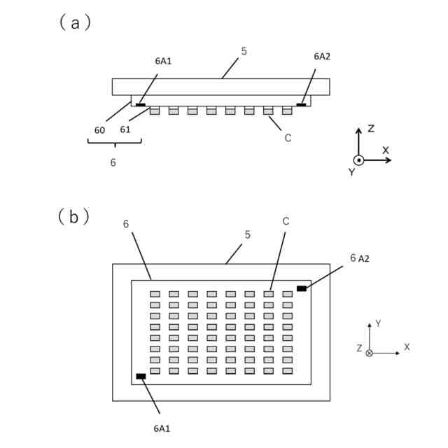 図6は、一度に複数のチップ部品Cを基板Bに実装する際に用いるスタンプについて説明するものであり、図6(a)が横から見た図であり、図6(b)はチップ部品Cを保持する面から見た図である。図6において、スタンプ6はスタンプ本体60に突起部61が配置されたものであり、突起部61はチップ部品Cを保持する機能を有しており、突起部61は実装箇所PCのピッチに合わせて配置してある。また、スタンプ6は突起部61のある面の反対側からスタンプベース5に保持されている。なお、スタンプ認識第1マーク6A1とスタンプ認識第2マーク6A2は、突起部61の配列に対して定まった位置に設けられており、スタンプ認識第1マーク6A1とスタンプ認識第2マーク6A2の位置からスタンプ6の位置情報が取得でき、スタンプ6に配置されている突起部61の配列も知ることができる。