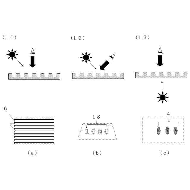 同じく、偽造防止策の例として、印刷又はエンボス加工等によって形成した凹凸形状を有する基材上に印刷画線を形成し、反射光下で傾けて観察した場合に凹凸形状から成る潜像画像が視認できる技術がある。