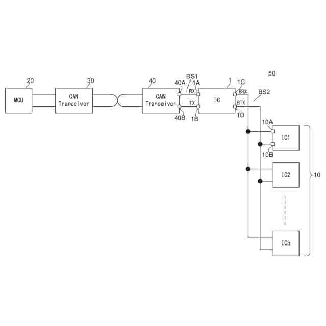 図1は、本開示の実施形態との対比のための第1比較例に係る通信システム501の構成を示す図である。通信システム501は、MCU(Micro Controller Unit)20と、CAN(Controller Area Network)トランシーバ30と、CANトランシーバ40と、半導体装置1と、n個(nは1以上の整数)のデバイス10と、を備える。通信システム501は、一例として車載用としており、以下説明する他の通信システムについても同様である。