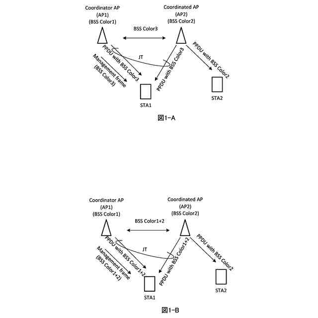 この非特許文献1による2つの方法では、JTの対象となるSTA1向けのデータ送信時に、データに付加されて2つのAPからそれぞれ送信されるBSS Colorの情報を一致させることができ、STA1では管理フレームにて予めこのBSS Colorの情報を把握しているため、自身が属するBSS内のデータであるとして受信、復調することができる。