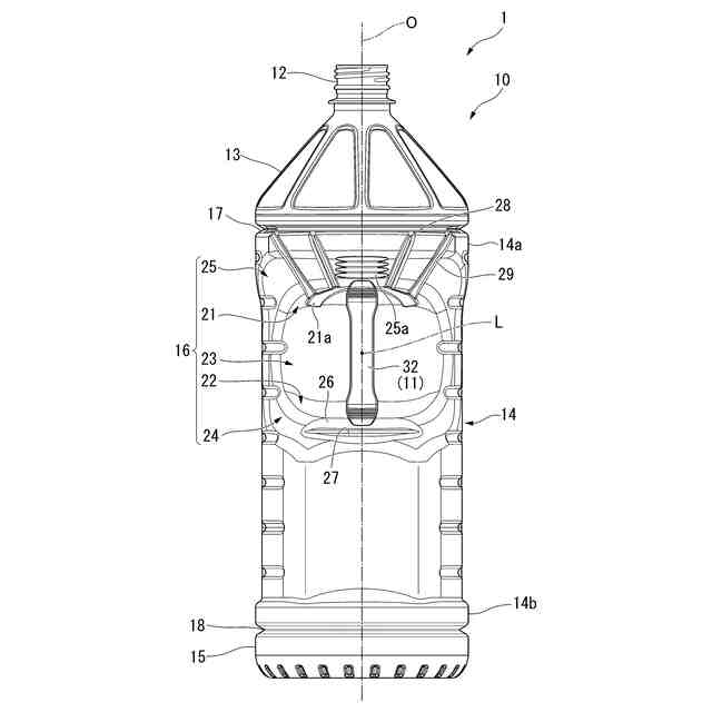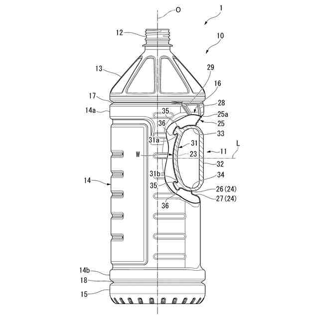上下方向に延びる中心軸線を有するボトルの胴部に、径方向のうち、前方に向けて窪み後方に向けて開口した取付凹部が設けられ、