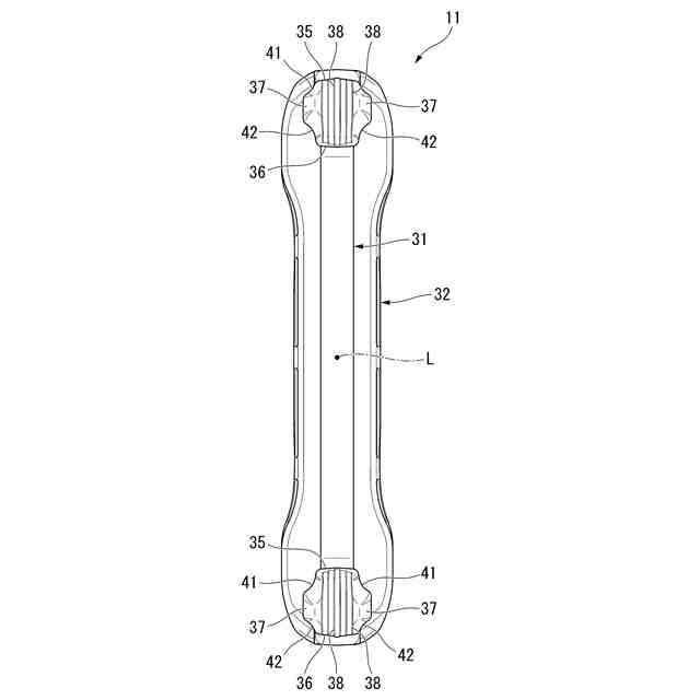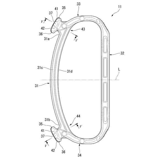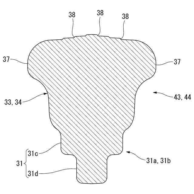 上下方向および前後方向に沿う断面視において、前記第1爪部、および前記第2爪部の各前部の曲率半径は、前記第1爪部、および前記第2爪部の各後部の曲率半径より大きく、前記第1断面視において、前記第3爪部の前部の曲率半径は、前記第3爪部の後部の曲率半径より大きく、前記第2断面視において、前記第3爪部の前部の曲率半径は、前記第3爪部の後部の曲率半径より大きく、上下方向および左右方向に交差し、かつ前後方向に沿う断面視において、前記第1爪部と前記第3爪部との接続部分の前部の曲率半径は、前記第1爪部と前記第3爪部との接続部分の後部の曲率半径より大きく、上下方向および左右方向に交差し、かつ前後方向に沿う断面視において、前記第2爪部と前記第3爪部との接続部分の前部の曲率半径は、前記第2爪部と前記第3爪部との接続部分の後部の曲率半径より大きくなっていてもよい。
