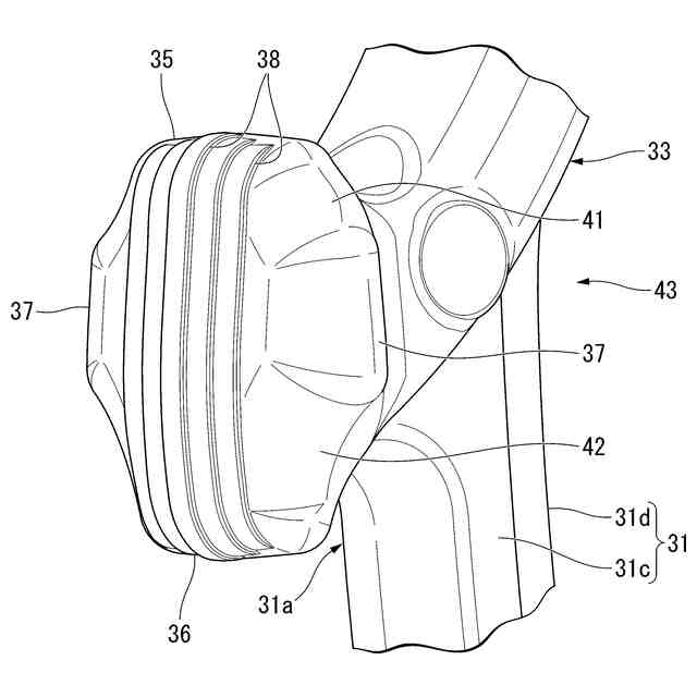 第1爪部および第2爪部が、上下方向および前後方向に沿う断面視において上下方向の外側に向けて突の曲線状を呈し、上連結部に形成された第3爪部が、前記第1断面視において左右方向の外側に向けて突の曲線状を呈し、下連結部に形成された第3爪部が、前記第2断面視において左右方向の外側に向けて突の曲線状を呈し、第1爪部と第3爪部との接続部分が、上下方向および左右方向に交差し、かつ前後方向に沿う断面視で斜め上方に向けて突の曲線状を呈し、第2爪部と第3爪部との接続部分が、上下方向および左右方向に交差し、かつ前後方向に沿う断面視で斜め下方に向けて突の曲線状を呈する。したがって、前述のブロー成形時に、上連結部および下連結部の各前端面に突当った合成樹脂材料を、それぞれの前端面の外周縁を全周にわたって抵抗少なく後方に向けて乗り越えさせることができる。