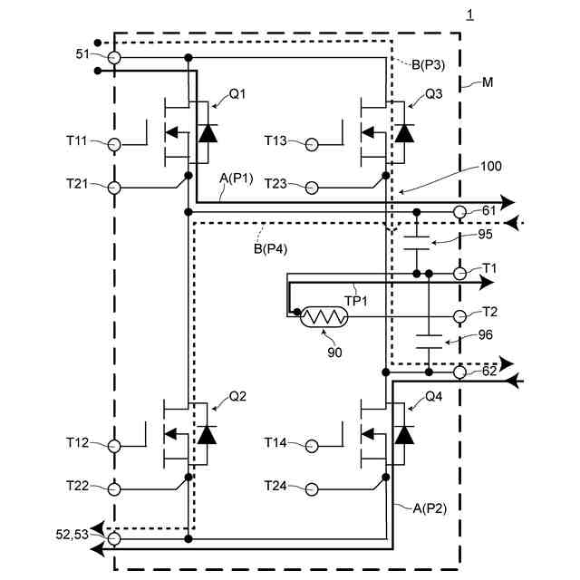 [1]本発明の一実施形態に係る半導体モジュールは、第1~第4半導体素子、複数の配線パターン、第1電源端子、第2電源端子、第1中点端子および第2中点端子を備え、スイッチング動作により、前記第1電源端子から前記第1中点端子に至る第1電流経路および前記第2中点端子から前記第2電源端子に至る第2電流経路を含む第1スイッチング経路、ならびに、前記第1電源端子から前記第2中点端子に至る第3電流経路および前記第1中点端子から前記第2電源端子に至る第4電流経路を含む第2スイッチング経路が排他的に形成されるフルブリッジ回路が構成されている半導体モジュールであって、第1温度検出電極および第2温度検出電極を有し、前記第1スイッチング経路および前記第2スイッチング経路に囲まれた領域に配置された温度検出素子と、前記第1温度検出電極に接続された第1温度検出配線パターンと、温度検出回路に接続するための端子であり、前記第1温度検出配線パターンに接続された第1温度検出端子と、前記第2温度検出電極に接続された第2温度検出配線パターンと、グランドまたは制御系電源に接続するための端子であり、前記第2温度検出配線パターンに接続された第2温度検出端子と、前記第1温度検出電極から前記第1温度検出端子に至る第1温度検出経路と、前記第1電流経路および前記第4電流経路の共通部分との間に配置された第1コンデンサと、前記第1温度検出経路と、前記第2電流経路および前記第3電流経路の共通部分との間に配置された第2コンデンサとをさらに備えることを特徴とする。