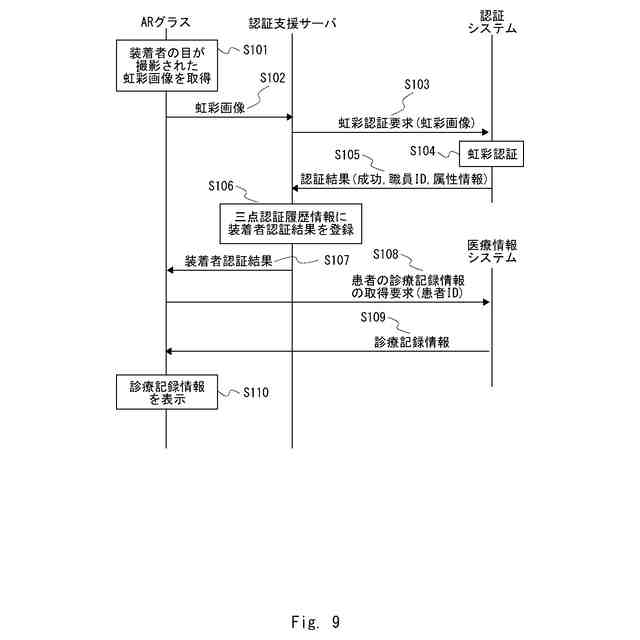 眼鏡型ウェアラブル端末の装着中における装着者の虹彩認証結果に基づき、当該装着者が所定の医療行為者であるかの装着者認証結果を取得し、