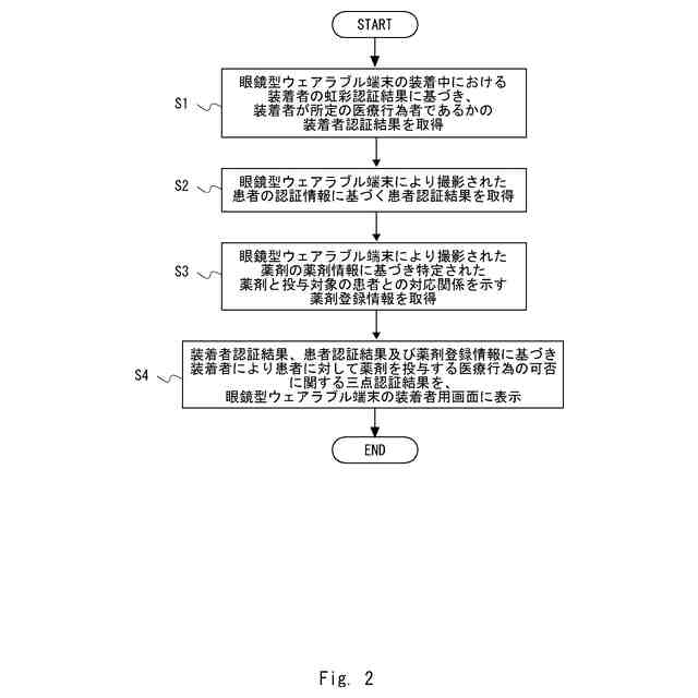 前記装着者認証結果、前記患者認証結果、及び、前記薬剤登録情報に基づき、前記装着者により前記患者に対して前記薬剤を投与する医療行為の可否に関する三点認証結果を、前記眼鏡型ウェアラブル端末の装着者用画面に表示させる。