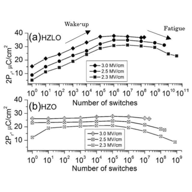 系強誘電体に対しては、前記ペロブスカイト系強誘電体と異なり、ウェイクアップ(Wake-up)及び分極疲労(Fatigue)といった分極特性の劣化が生じることが報告されている(非特許文献2参照)。前記ウェイクアップや前記分極疲労は、書き換え処理の経過とともに自発分極が大きく変化し、分極特性が不安定であることを意味する。