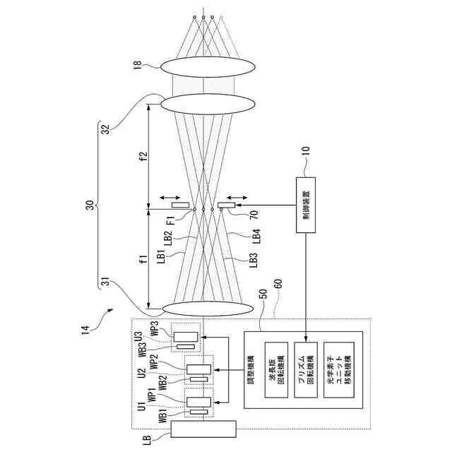 前記分岐機構が前記レーザ光の光路上に直列に配置され、前記分岐機構が1/2波長板と、ウォラストンプリズムと有する光学素子と、前記1/2波長板を光路周りに回転させる波長板回転機構と、前記ウォラストンプリズムを前記光路周りに回転させるプリズム回転機構と、を備えてもよい。