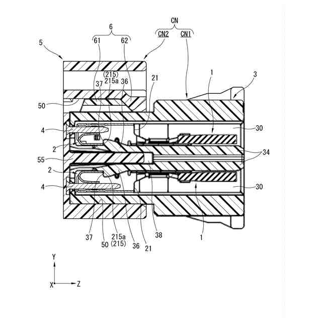 このコネクタCN´では、例えば図7に示すように、雌コネクタハウジング3の内部に設けられた端子収容部30の底壁31に、基端部361が片持ち状に支持されていて基端部361を支点として弾性変形可能に形成されたランス36を有している。このランス36の先端部362には、雌端子金具2の筒状部21の第1壁部211に開口するランスホール215の開口縁部に係止する係止溝37が設けられている。係止溝37は、雌端子金具2の第1壁部211に概ね平行な水平面371と、この水平面371から概ね垂直状に立ち上がり、端子挿入方向においてランスホール215の被係止面215aと対向する係止面372と、を有している。そして、コネクタCN´では、ランス36の係止溝37がランスホール215の開口縁部に係止することによって、雌端子金具2が雌コネクタハウジング3に係止状態に固定されている。