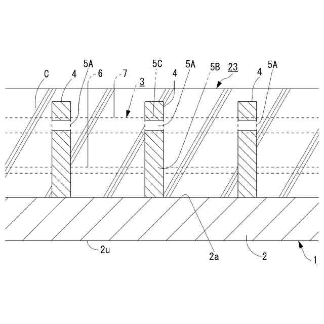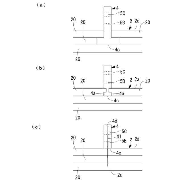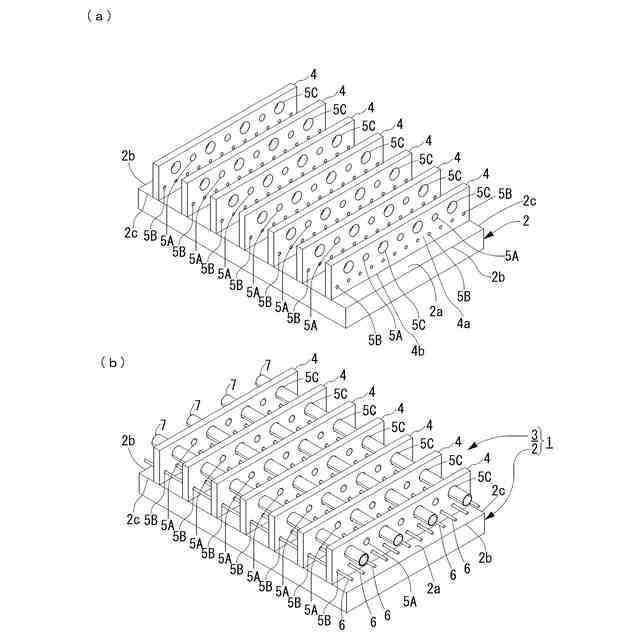 図1(b)に示すように、突出部3は、木質板2のコンクリート打設面2aに所定の間隔を隔てて並ぶように設けられて木質板2に固定された複数の板材4,4…と、複数の各板材4,4…に形成されてコンクリート打設面2aに打設されるコンクリートを入り込ませるための貫通孔5A,5A…と、複数の各板材4,4…に形成された貫通孔5B,5B…を貫通するように設けられた鉄筋6,6…と、複数の各板材4,4…に形成された貫通孔5C,5C…を貫通するように設けられたボイド部材7,7…とを備えて構成される。