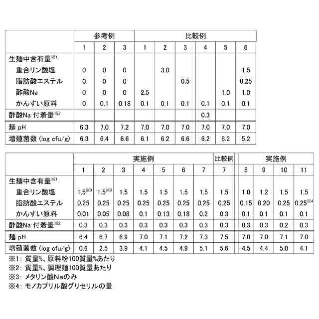 従来の中華麺類は、一般にかんすいを含むためpHが比較的高く、通常pH10程度である。しかしpHが高い麺には、冷蔵保存下でぼそついた食感になりやすいなど、経時的な食感低下の問題がある。かんすい使用量を低減することなどにより中華麺類のpHを中性付近に調整することで、経時的な食感低下の問題を改善することができる。一方で、pHが中性付近の麺類は、微生物繁殖のリスクがある。一般に、pHが高い麺類は微生物が繁殖しにくく、またpH6以下の麺類には、酢酸ナトリウム等の有機酸塩を含む静菌剤が効きやすい。これらに対して、pHが中性付近の麺類は、有機酸塩が静菌剤として効きづらいため、微生物制御が難しい。多量の静菌剤の添加は麺類の食味に影響することがあるため好ましくない。