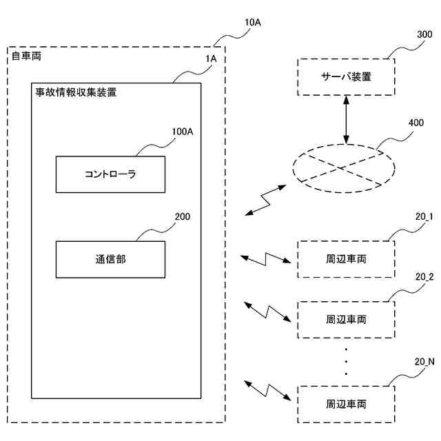 形態3;本発明の1またはそれ以上の実施形態は、コントローラと、通信部と、センサと、を備え、前記コントローラは、1つまたは複数のプロセッサと、前記1つまたは複数のプロセッサに通信可能に接続される1つまたは複数のメモリとを含み、前記1つまたは複数のメモリは、自車両に関する登録情報を含む自車両情報を記憶するストレージを含み、前記1つまたは複数のプロセッサは、車両損傷を伴う事故の発生を前記センサにより検知した場合には、前記通信部を介して、前記自車両の周辺車両に前記自車両情報を送信させるとともに、前記周辺車両から周辺車両情報を受信させ、前記事故の発生情報と、前記自車両の位置情報と、前記自車両情報と、前記周辺車両情報とを紐づけた事故情報を生成し、前記通信部を介して、前記事故情報をサーバ装置に提供することを特徴とする車両事故情報収集装置を提案している。