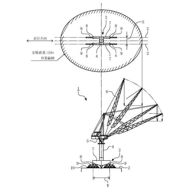 この種の軌道走行式クレーンを設置するための前提条件として、その基礎が耐え得る許容車輪圧というものが存在するが、例えば、軌道走行式クレーンの走行体の脚部が前後左右に備えられている場合、各脚部を結んだ矩形の対角方向にジブが向くように旋回し、斯かる状態で最大荷重を吊り上げながら前記ジブをある伏せ角度(最大モーメント発生状態)まで伏せた時に、前記対角方向に配置される脚部の何れかに最大車輪圧が発生することが判っており、この条件下で発生する最大車輪圧が前記基礎の許容車輪圧を超えないように配慮する必要がある。