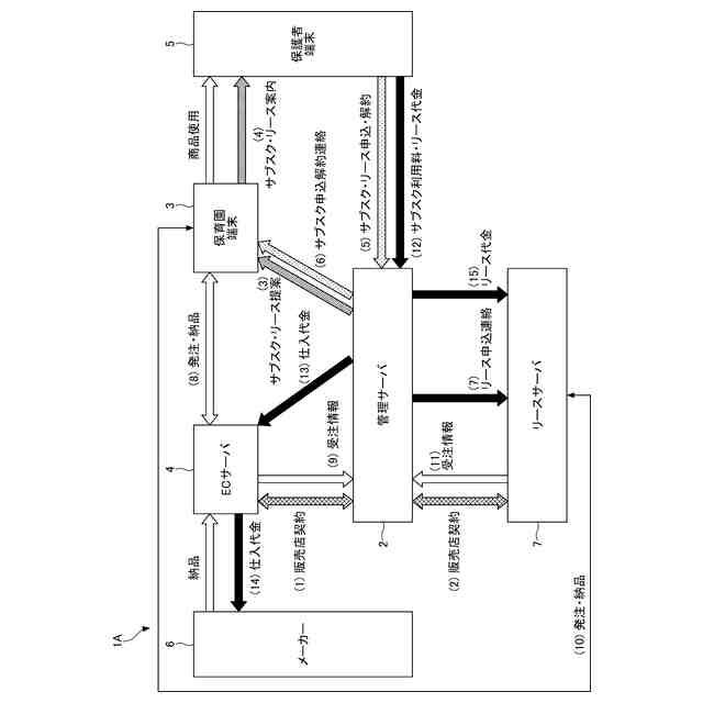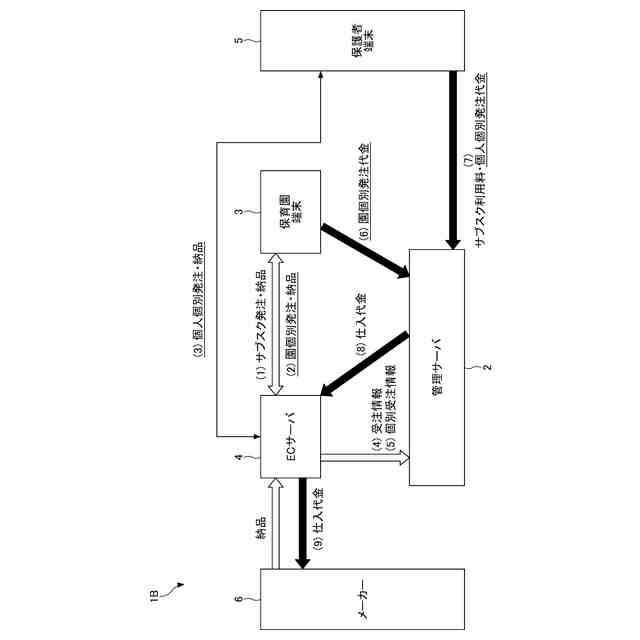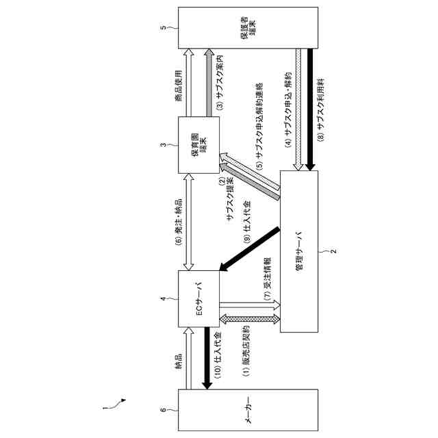 同様に、本発明の実施形態の一観点に係る管理サーバは、登録施設に関連付けられる利用者に対して特定の物品のサブスクリプションサービスを提供し、前記サブスクリプションサービスの管理を行う管理サーバであって、前記登録施設が所有し、ネットワークを利用して前記サブスクリプションサービスに関する前記特定の物品の発注を行う端末装置からの受注情報の受信に応じて、前記特定の物品を前記受注情報に基づき受注先の前記登録施設に提供する旨の指示を出力する物品提供元サーバから前記受注情報を受信し、前記ネットワークを介して前記利用者から前記サブスクリプションサービスの利用料を徴収し、前記徴収した利用料の中から前記受注情報に応じた代金を、前記受注情報を送信した前記物品提供元サーバに前記ネットワークを介して送金する代金管理部を有する。