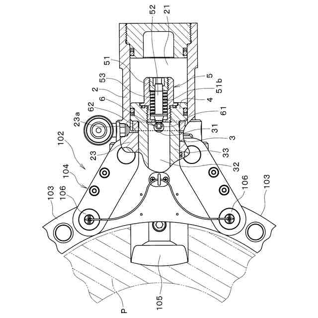 図2~4によく示すように、油圧破砕機102の油圧アクチュエータ1は、コンクリート柱Pの中心に水平に軸心を向けて配置される油圧シリンダ2、ピストンロッド3、ピストン4を具備する。ピストンロッド3の先端に破砕刃105が固着される。油圧シリンダ2のロッドカバー23にフレーム組立体104が組み付けられる。