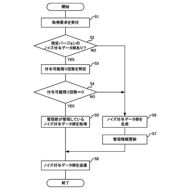 前記取得部は、前記ノイズ付与データ群を生成する場合、前記指定バージョンよりも前のバージョンに対して前記管理部が管理している前記ノイズ付与データ群に対応する所定のデータ群と、前記指定バージョンに対応する所定のデータ群との差分を示す差分データ群に対してノイズを付与したノイズ付与差分データ群を生成し、当該ノイズ付与差分データ群と、前記指定バージョンよりも前のバージョンに対して前記管理部が管理している前記ノイズ付与データ群とを合わせて、前記指定バージョンに対応するノイズ付与データ群を生成する、