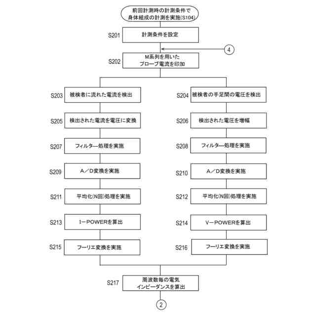 従来から、被検者の体脂肪重量、体水分量などの身体組成を生体電気インピーダンス法に基づいて計測する装置が知られている(例えば、下記特許文献1~4を参照)。この装置では、被検者の身体に複数の周波数からなる微弱な交流電流を流したときの被検者の身体に生じる電圧と被検者の身体に流れる電流とに基づき被検者の身体の生体電気インピーダンスを測定し、測定された生体電気インピーダンスから身体組成を算出する。