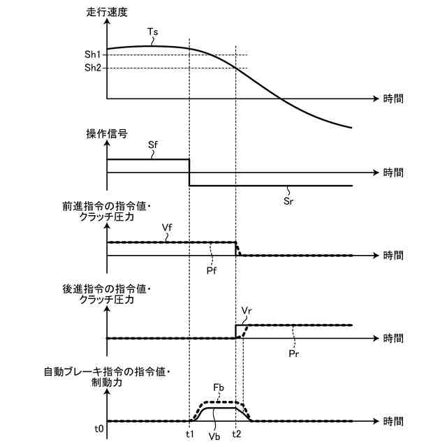 前記動作条件を満足すると判定された場合、前記進行方向を切り換える前後進切換指令の出力を禁止する走行制御部と、を有する、