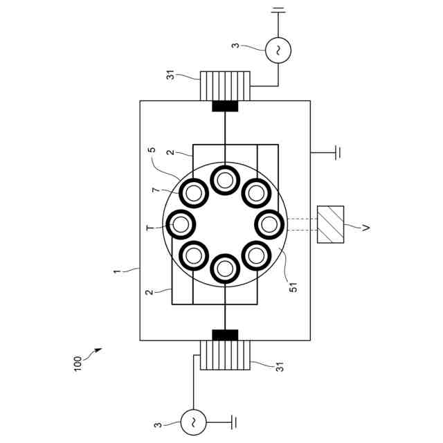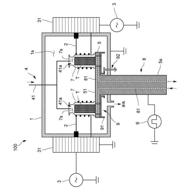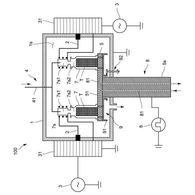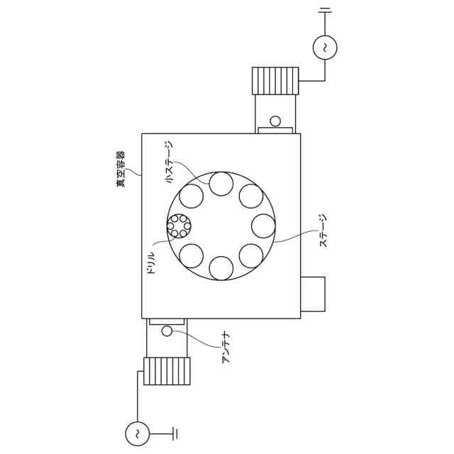 プラズマを用いて工具の表面の被膜を除去する装置として、例えば特許文献1に示すプラズマ処理装置が知られている。このプラズマ処理装置は、図7及び図8に示すように、真空容器内に設置した円板状のステージ上に被処理物であるドリルを多数配置し、真空容器内にアルゴンガスを導入するとともに真空容器の外部に設置したアンテナにより誘導結合型のプラズマを真空室内に生成させ、ステージにバイアス電圧を印加することで、プラズマ中の正イオンをドリルの表面の被膜に入射させて除膜するように構成されている。このプラズマ処理装置では、ステージに配置した多数のドリルを均一に除膜できるように、ステージは自身の中心を軸にして回転するとともに、ステージ内に周方向に沿って設けた複数の小ステージがさらに自身の中心を軸にして回転するように構成されている。