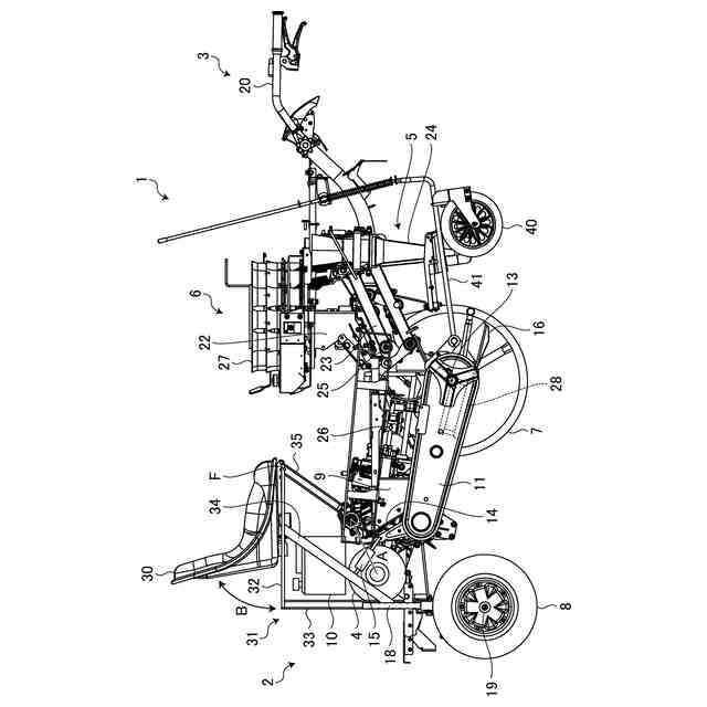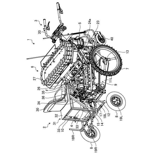 従来の発明においては、エンジンにより発電された電力を作業用電動モータの動力として利用する。作業用電動モータは、車体の後方に配置されており、作業機専用のモータである。バッテリは、座席の下方に配置されるが、前方の重量バランスをとるためのものではなく、車体の中央に配置される。従来の発明は、走行動力がエンジンから供給され、エンジンにより重量バランスがとられる。