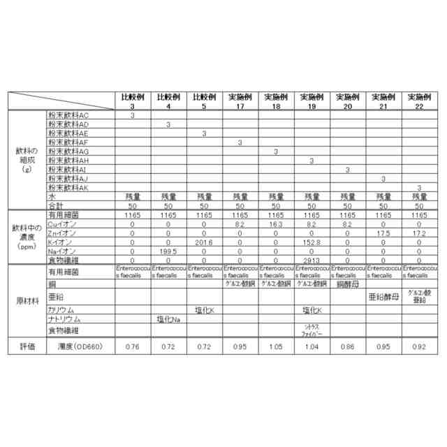 本出願人は、上記課題を鑑みて鋭意検討を行った結果、銅及び/又は亜鉛を含有する飲料に対して、乳酸菌などの有用細菌を配合することにより、銅や亜鉛に由来する金属臭や苦味が軽減されることを見出し、本発明を完成させるに至った。また、有用細菌と共に、銅及び/又は亜鉛を含有させることにより、有用細菌の沈殿が抑制されることを見出し、本発明を完成させるに至った。