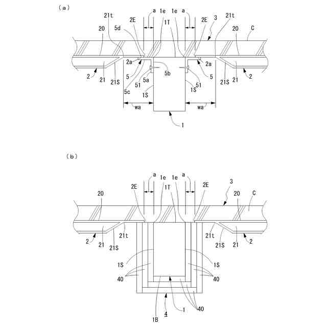 (2)フラットデッキ2のリブ21の端部側の傾斜縁21Sの上端21tと木梁1の側面1Sとの間の間隔wbが狭くなり、木梁1の側面1Sに設けられる石こうボード40の上端側とリブ21の端部側の傾斜縁とが干渉してしまう可能性があり、干渉する場合は、石こうボードを切欠かなければならなくなる。この場合、図3(b)に示すように、切欠いた部分の切断面40tとリブ21の端部側の傾斜縁21Sとの間に隙間Sが生じてしまうので、耐火性能上必要な耐火被覆4の被覆厚を満足しなくなる可能性があり、所望の耐火性能を得られない耐火構造となってしまう可能性があった。