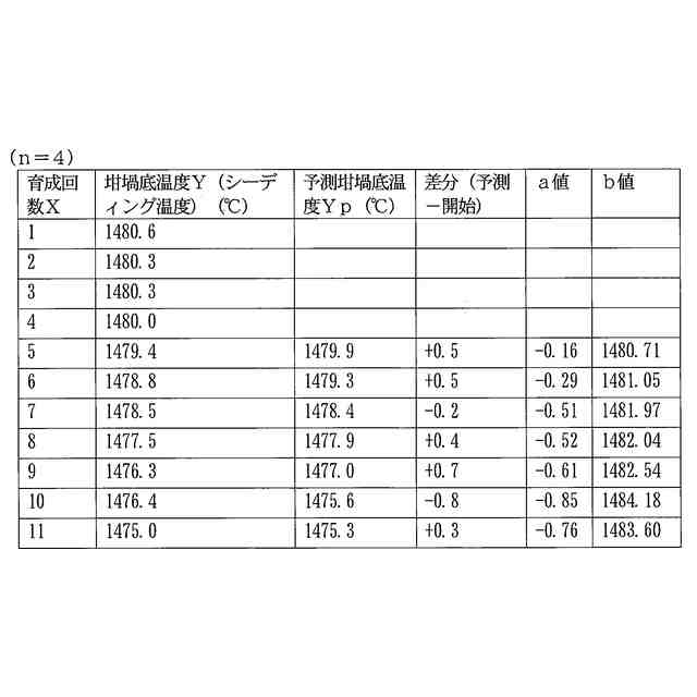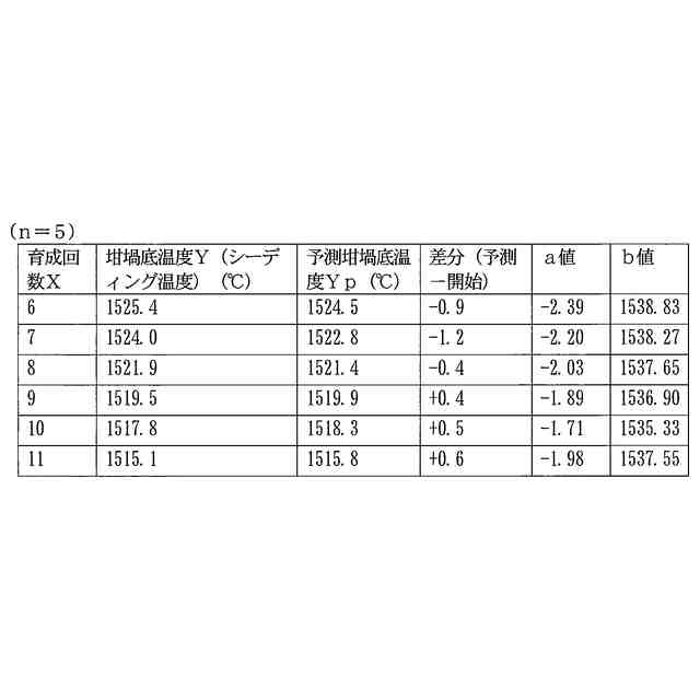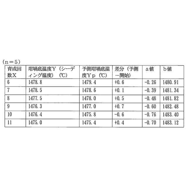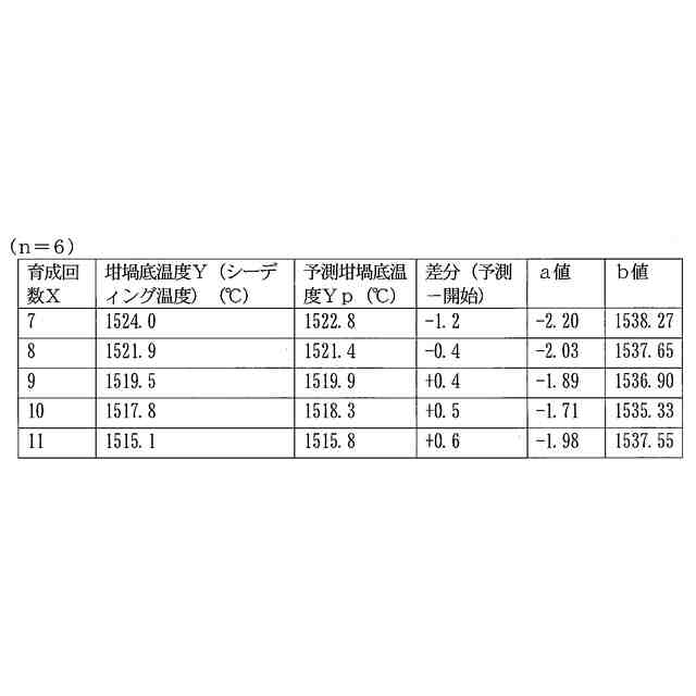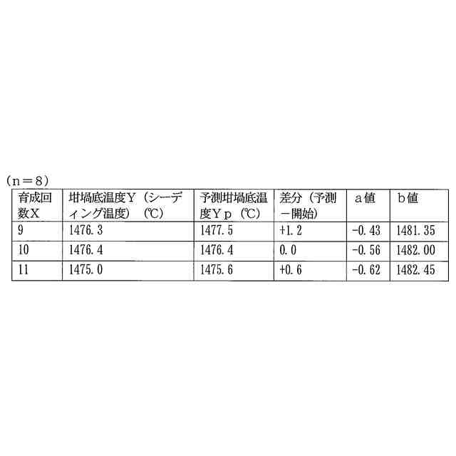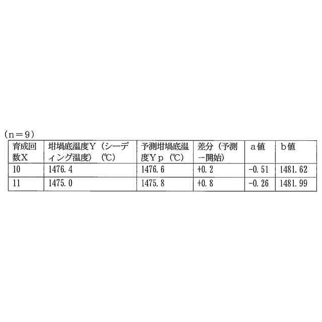 前述した特許文献2に記載のシーディング操作方法は、同一炉内の坩堝を用いて繰り返し単結晶を育成する上で、過去の育成回毎の原料融解時の坩堝底温度Xnとシーディング操作時の坩堝底温度Ynとの関係に着目し、これから実施しようとする育成回におけるシーディング操作時の坩堝底温度を予測するものである。