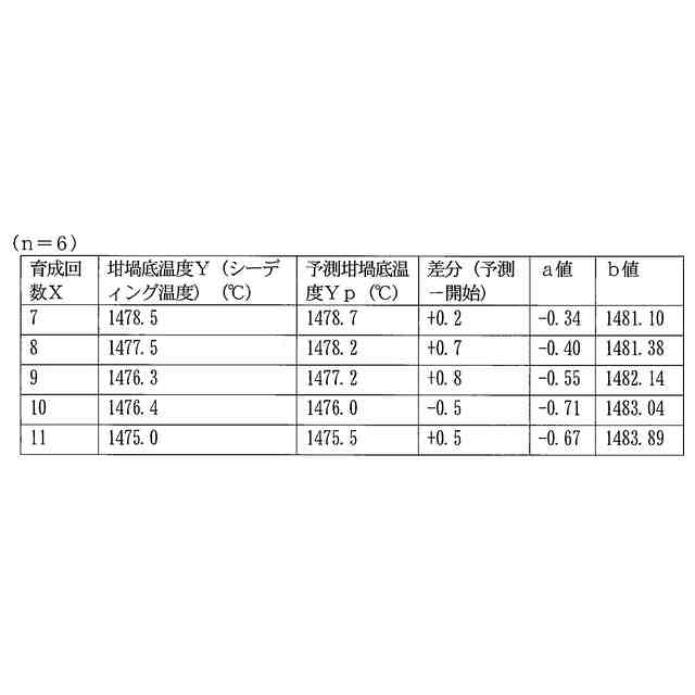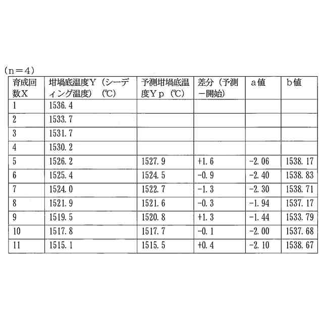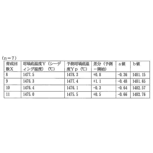 更に、シーディング操作時の坩堝底温度を予測するに当たって、第一工程では、過去の育成回毎の原料融解時の坩堝底温度Xnとシーディング操作時の坩堝底温度Ynの全てのデータを用いて関係式を作成しており、大まかに見れば、炉体を構成する耐火物の劣化や、熱電対の劣化に起因する見かけ上の坩堝底温度の低下は、直線上の関係になる。しかし、炉体を構成する耐火物の劣化や、熱電対の劣化の度合は一定と限らず、育成の回数によって見かけ上の坩堝底温度の低下の傾向に微妙な変化があることが分かった。