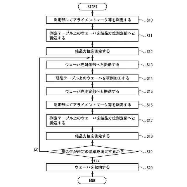 面取りの条件は、アライメントマークが付された部分を研削することも考慮して設定される。そのため、アライメントマークの位置等のウェーハの形状に関する情報が光電センサ等により取得され、条件設定に利用される(特許文献1)。面取りは、一般に、研削テーブル上に保持されたウェーハに研削砥石を当接させて行われる。この場合、研削条件には、例えば、研削砥石のウェーハに対する進入角度、研削テーブルの移動速度、研削砥石・研削テーブルの回転速度、及び、研削砥石と研削テーブルとの相対位置等が含まれる。