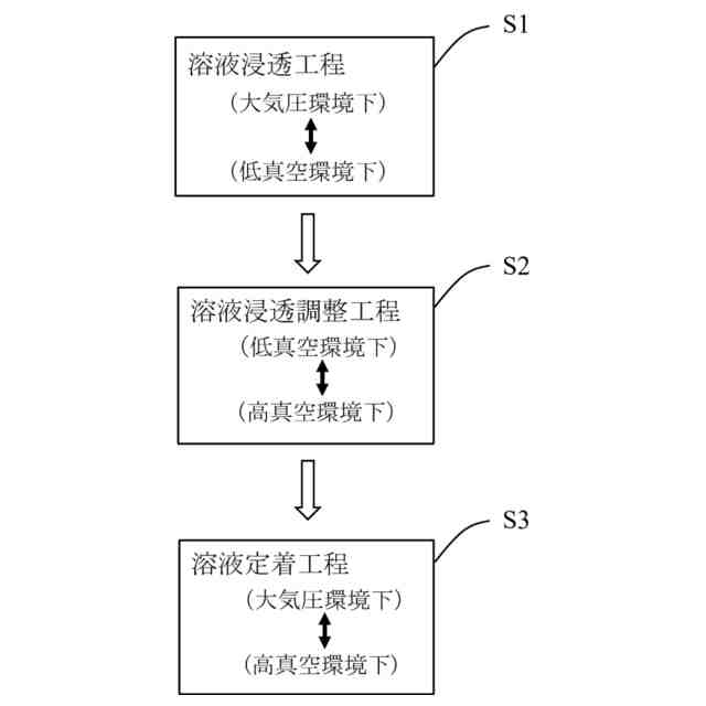 前記溶液を浸透させたペレットを、浸漬させた前記溶液から分離し、ゲージ圧力が-0.08MPa以下の高真空環境下に置いて、該ペレット内に前記溶液を担持させる溶液定着工程と、