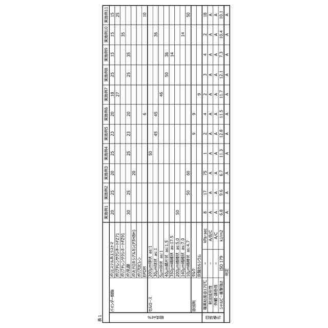 各実施例及び各比較例の成形用材料に関する、原材料の組成及び評価結果を示す表1。