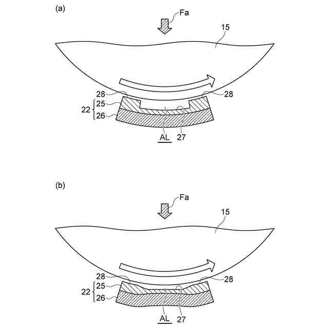 前記トップフォイルは、前記回転軸に対面する内周面を備えた母材を備え、