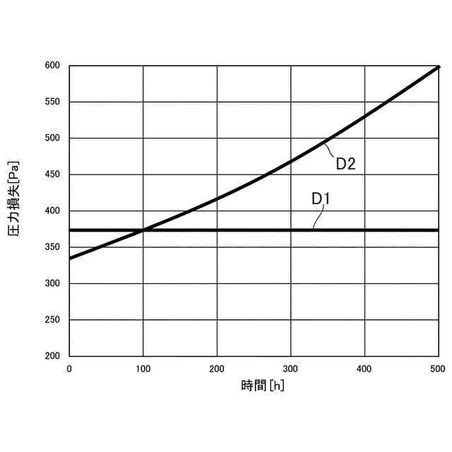 膨らみ防止部材を有する本実施形態におけるフィルタパックと、膨らみ防止部材を有しない比較例としてのフィルタパックとの長期通風試験の圧力損失の推移を示すグラフ。