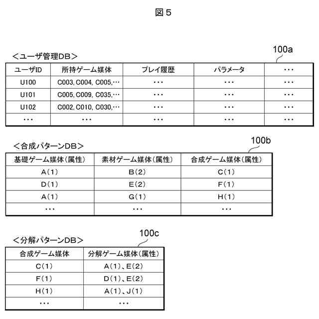 ユーザ管理DB、合成パターンDB及び分解パターンDBの一例を示す図である。