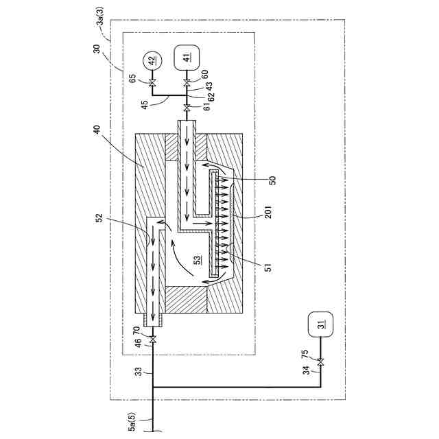 特許文献1の蒸着装置は、いわゆる、ガスキャリア蒸着装置であり、粉体状の薄膜形成材料を気化室内の材料配置領域に配し、キャリアガス導入配管から高温の加熱キャリアガスを薄膜形成材料に吹き付けることで薄膜形成材料を気化して材料ガスを生成する。そして、キャリアガスで生成した材料ガスを製膜室まで流送し、製膜室内においてキャリアガスと材料ガスの混合ガスである製膜ガスを基材に対して吹き付ける構造となっている。