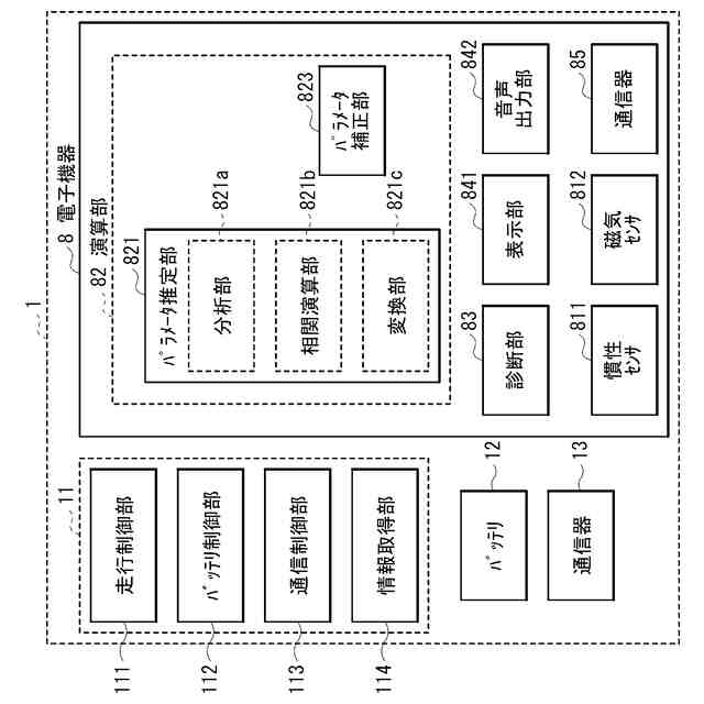 この車両1は、図1,図2に示したように、車両制御部11、バッテリ12および通信器13を備えている。また、図1に示したように、この車両1の内部には、電子機器8が所定の姿勢状態にて設置されている。この電子機器8は、例えば、車両1のユーザ9(運転者を含む乗員など)が保有しているか、あるいは貸与されている機器であり、例えばスマートフォンやタブレット等により構成されている。