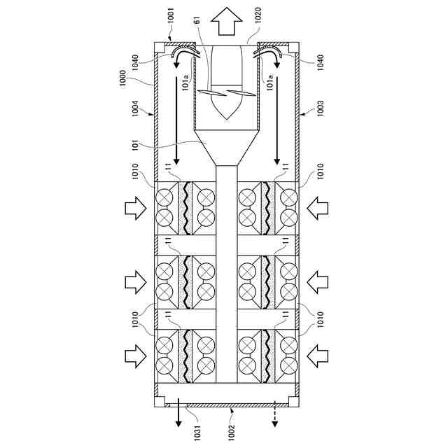 第2の開示は、請求項1に記載の二酸化炭素回収装置(1)において、前記分流部(1040)は、分流した気体によって前記外装体(1000)内に気体の流れを生じさせること、を特徴とする二酸化炭素回収装置(1)である。