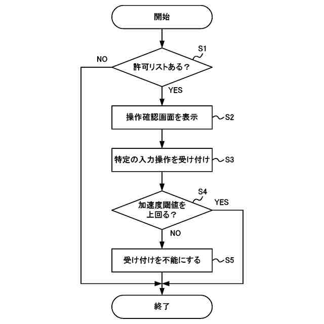 本発明の第1の態様にかかるプログラムは、加速度を測定する加速度センサと、入力操作を受け付ける操作受付部とを有する端末を動作させるコンピュータを、前記操作受付部が入力操作を受け付けた場合に、前記操作受付部が入力操作を受け付けた時点を含む所定の期間において前記加速度センサが測定した加速度に基づいて、前記操作受付部が受け付けた入力操作が、前記端末を所持するユーザによる操作であるか否かを判定する判定処理を実行する判定部、及び前記操作受付部が受け付けた入力操作が前記ユーザによる操作ではないと前記判定部が判定した場合に、前記判定部が前記判定処理を実行した後における前記操作受付部による所定の入力操作の受け付けを不能にする操作制御部、として機能させる。