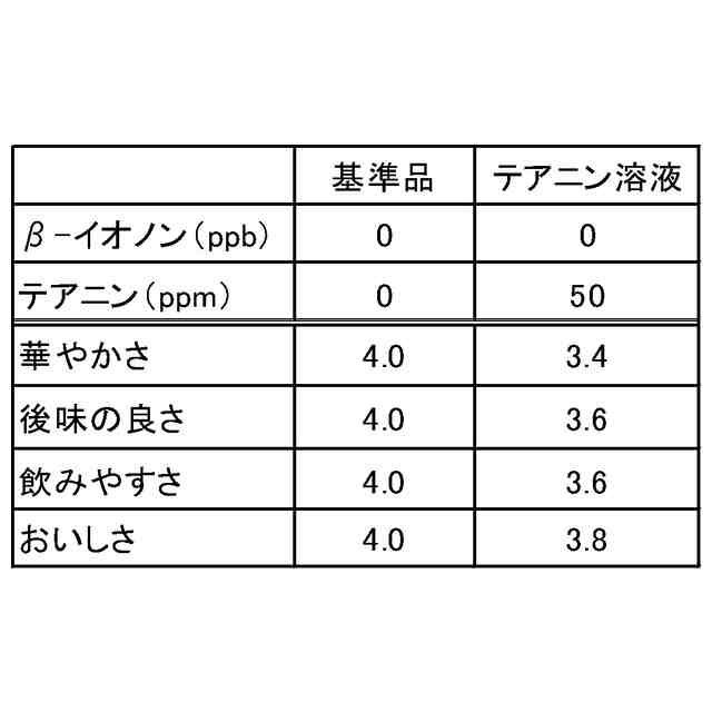 前記テアニン(ppm)に対する前記β-イオノン(ppb)の比はppb換算で0.0001~0.02である、
