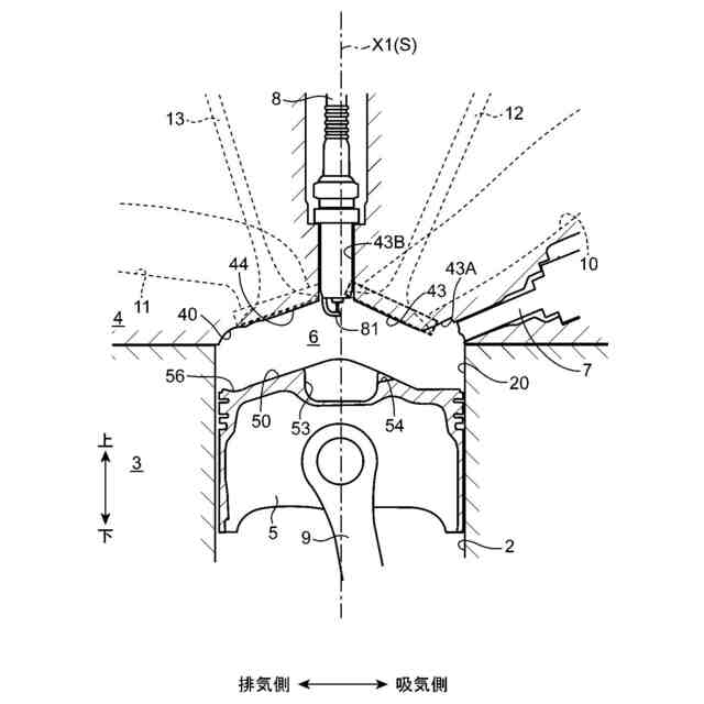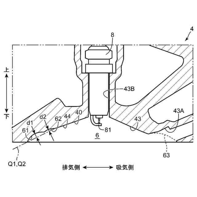 前記特許文献1の燃焼室構造では、燃焼室の天井面に形成された凹部に沿って吸気が流れることで、圧縮上死点付近までタンブル流を維持できる。しかしながら、点火プラグに対して吸気側の部分に凹部が形成されていることで、タンブル流が吸気側に偏った位置に形成される。そのため、初期火炎が吸気側の燃焼室壁面と接触しやすく、冷却損失が増大して熱効率が低くなるおそれがある。