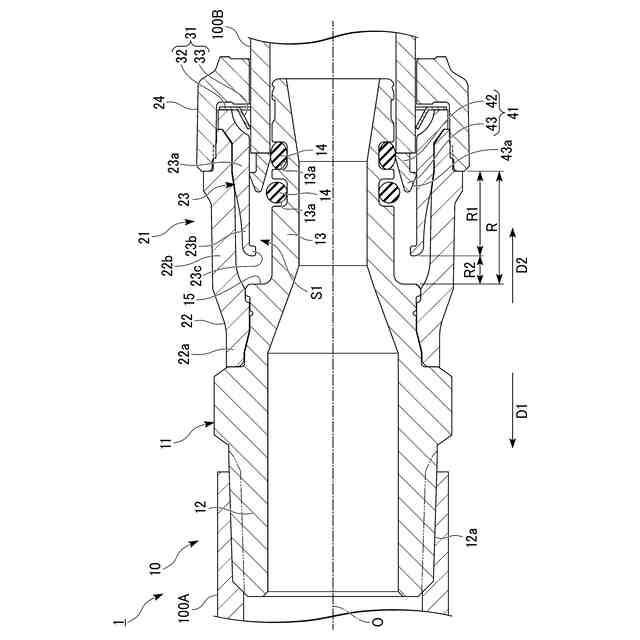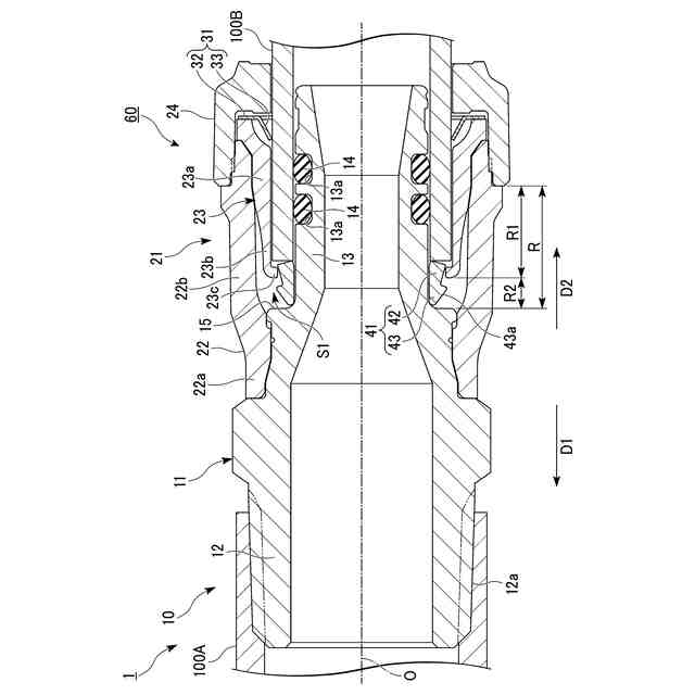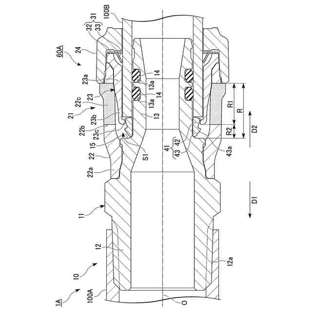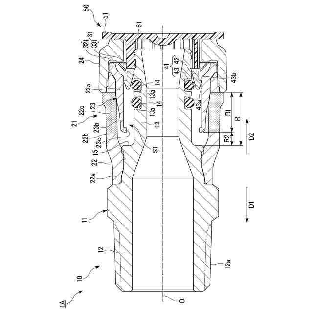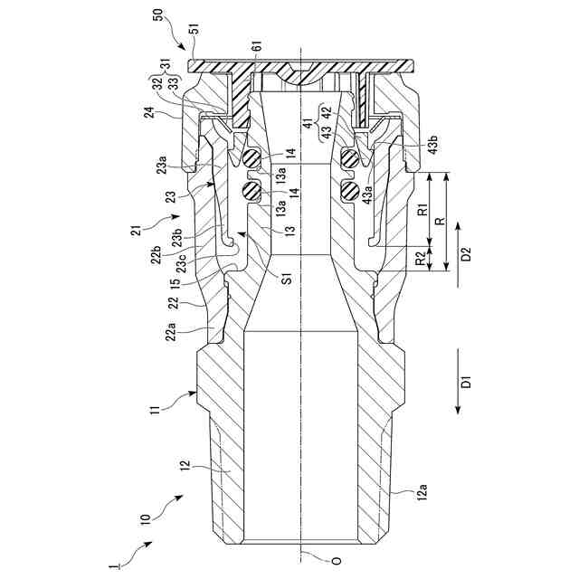 ここで、継手本体11及びボディ21は筒状に形成され、抜け止め部材31及びガイドリング41は環状に形成されている。継手本体11、ボディ21、抜け止め部材31、及びガイドリング41それぞれの中心軸は、共通軸と同軸に配置されている。以下では、共通軸を軸線Oと言う。軸線Oに沿う方向を軸線O方向(軸方向)と言う。軸線Oに直交する方向を径方向と言い、軸線O回りに周回する方向を周方向と言う。