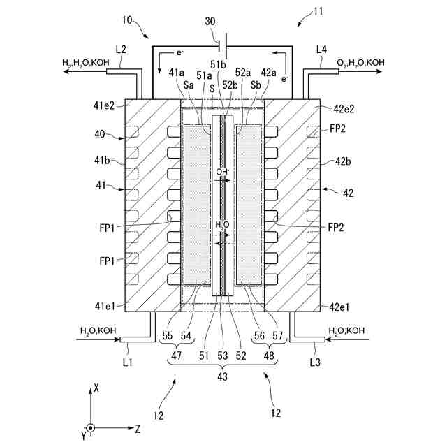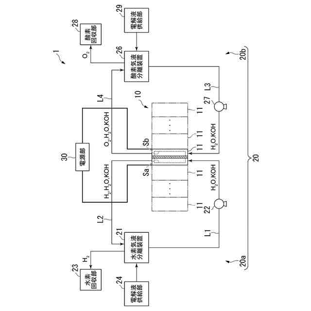水素を生成するための装置として、水を電気分解する装置(電解装置)が知られている。この種の装置では、イオン交換膜によって陰極室と陽極室に区画された電解槽内に水を充填し、陰極と陽極に電力を供給することで水の電気分解が行われる。陰極室では水と電子の反応によって水素が発生する。この反応によって生じた水酸化物イオンはイオン交換膜を透過して陽極室に到達する。陽極室ではこの水酸化物イオンから、酸素と水が発生する。このような反応が継続することで、大量の水素を得ることができる。