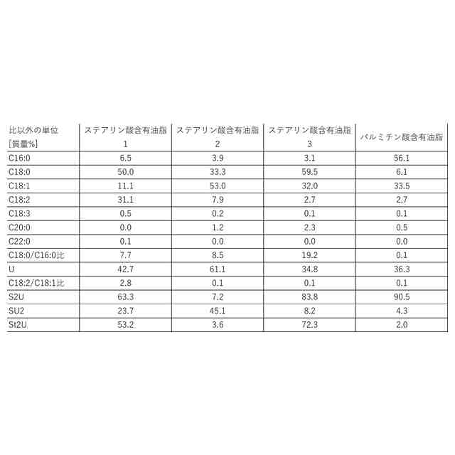 なお、Sは炭素数16~22の飽和脂肪酸を、Uは炭素数18の不飽和脂肪酸で、オレイン酸とリノール酸とリノレン酸をさす。そしてS2Uはトリグリセリド内にSが2分子、Uが1分子結合したものである。