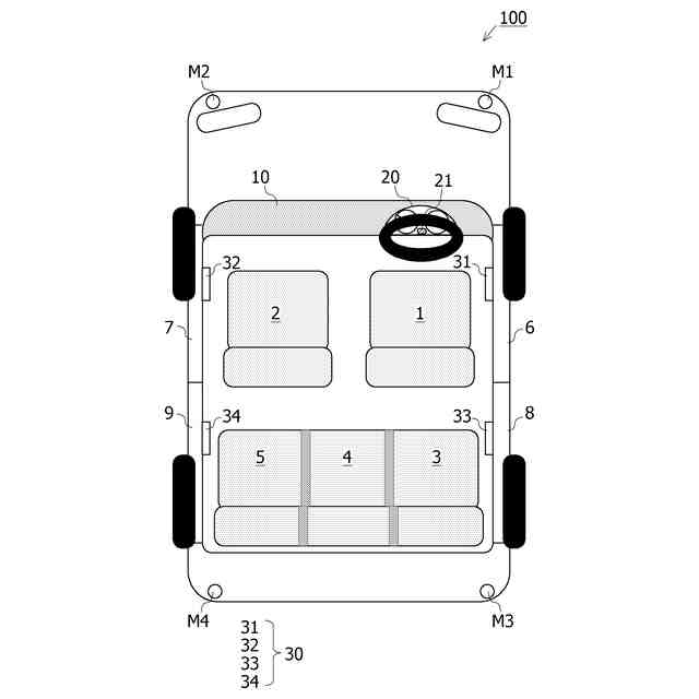 以下、図面を参照して実施形態について説明する。図1は、実施形態に係る車両100の一例を示す図である。図1は、車両100を上方から見た図である。また、図1は、車両100の車内を説明するため、天井の図示を省略している。車両100は、例えば、乗用車である。車両100は、車両100の右前隅に配置されて右前方の障害物を検知する障害物センサM1、車両100の左前隅に配置されて左前方の障害物を検知する障害物センサM2、車両100の右後隅に配置されて右後方の障害物を検知する障害物センサM3及び車両100の左後隅に配置されて左後方の障害物を検知する障害物センサM4を備える。すなわち、障害物センサM1、M2、M3、M4の夫々は、車両100の四隅に配置される。