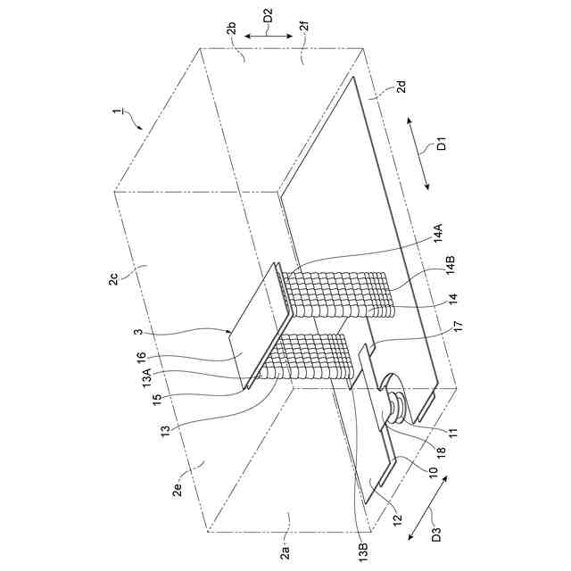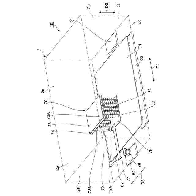 二つの前記導体のうちの少なくとも一つの前記導体において、当該導体を前記積層方向から見たときに、二つの前記導体の対向方向に直交する方向の第一長さが、前記対向方向の第二長さよりも長く、