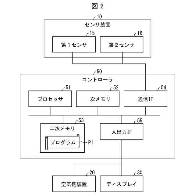 前記センサ装置の検知結果に応じて、前記空気砲装置から吐き出される煙の大きさ又は速度の少なくとも何れかを制御するコントローラと、を備える、